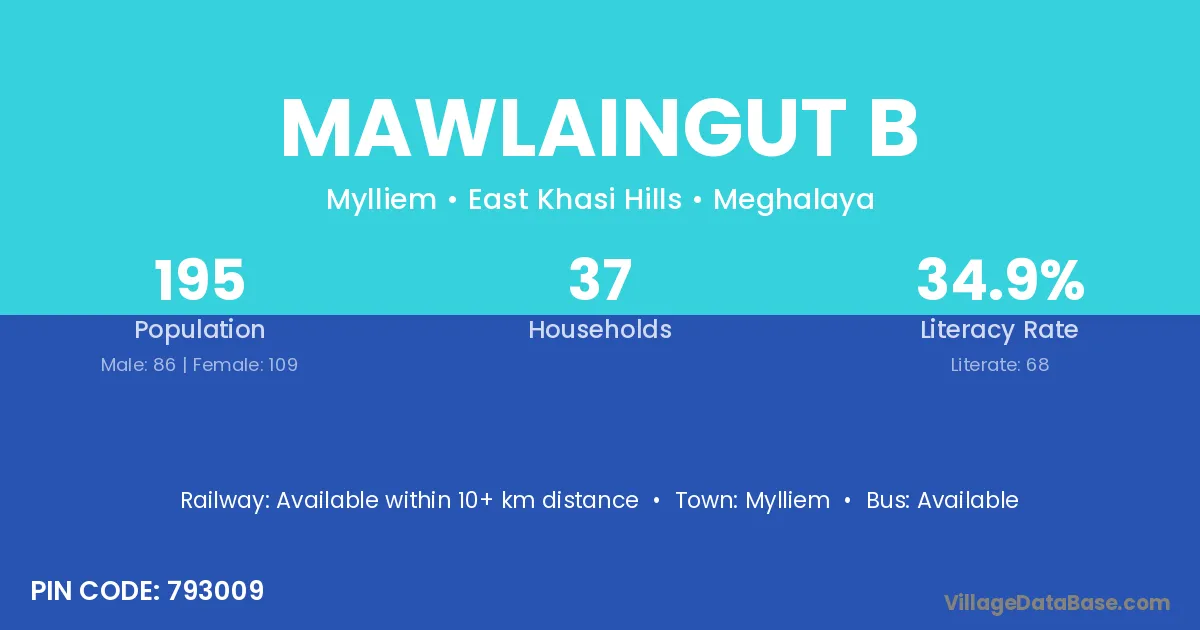 The literacy rate of Mawlaingut B village is 34.87%. Male literacy stands at 25.58% and female literacy at 42.20%.