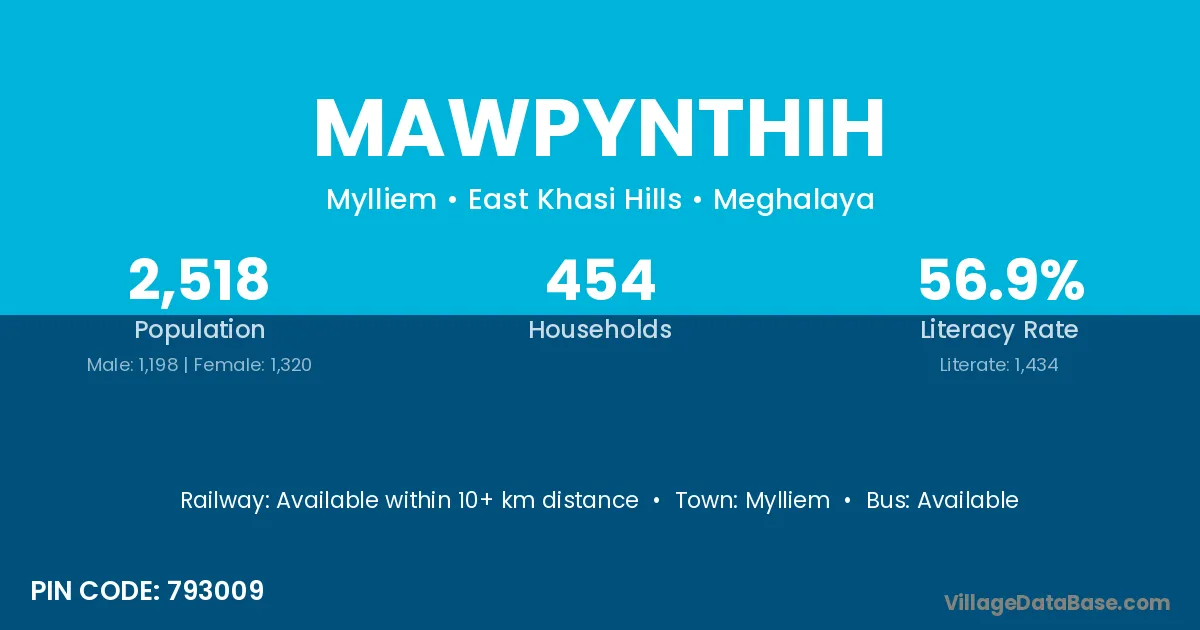 Mawpynthih village has a total population of 2,518 people, of which 1,198 are males and 1,320 are females.