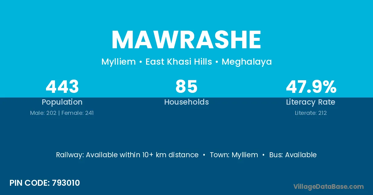 Mawrashe village has a total population of 443 people, of which 202 are males and 241 are females.