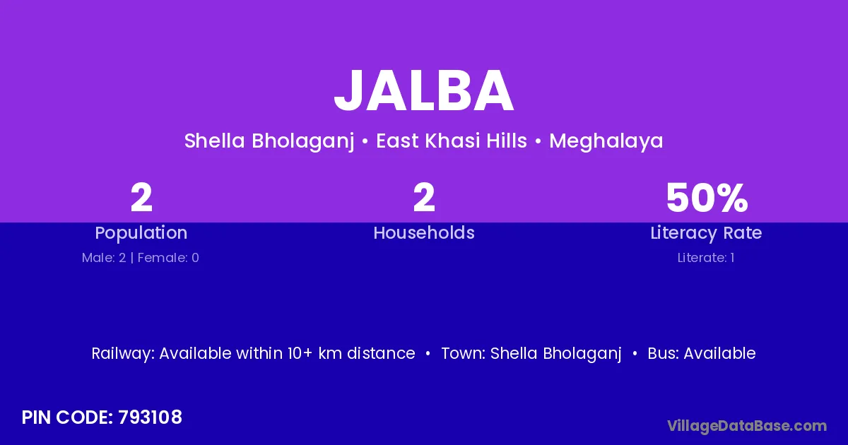 Jalba village has a total population of 2 people, of which 2 are males and 0 are females.