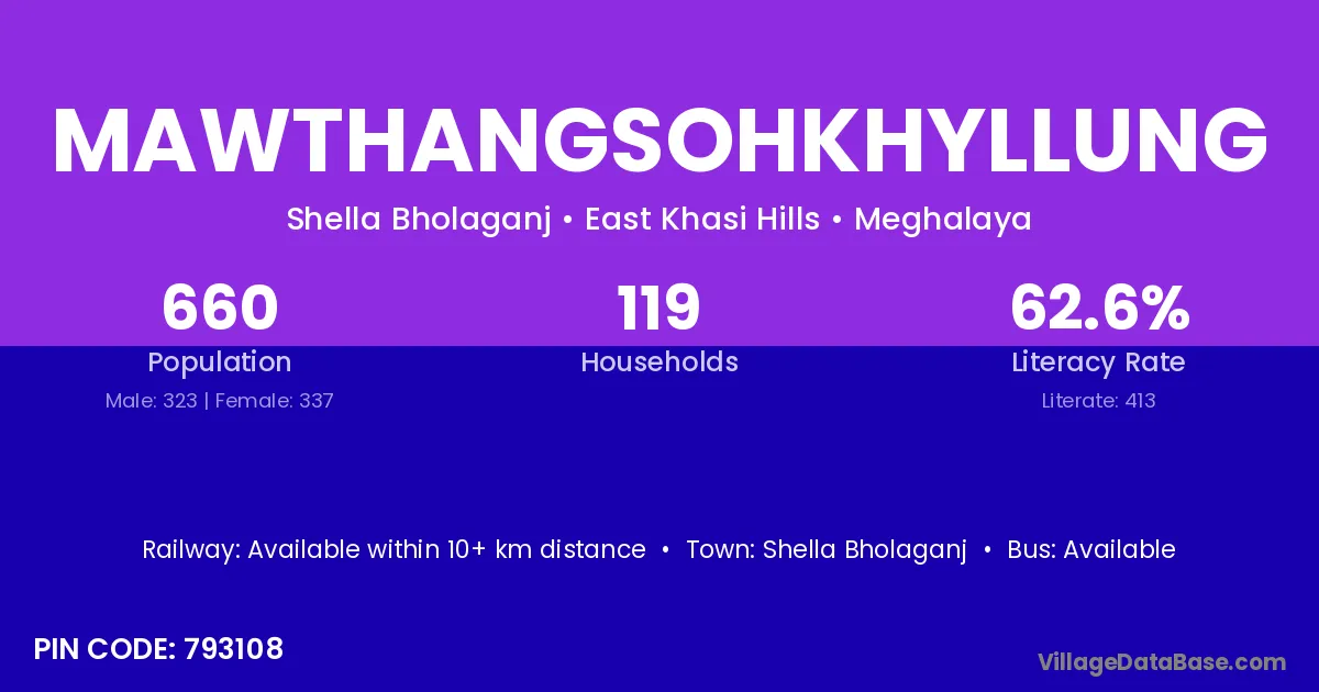 Mawthangsohkhyllung village has a total population of 660 people, of which 323 are males and 337 are females.