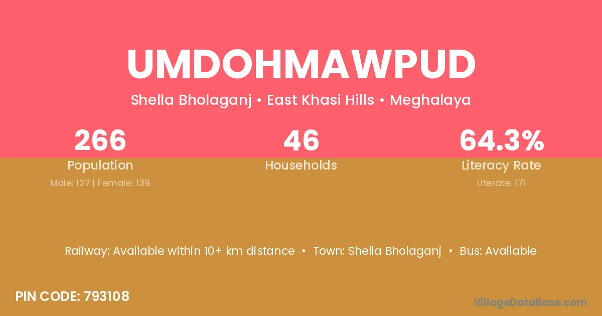 Shella Bholaganj is the nearest town to Umdohmawpud village for major economic activities