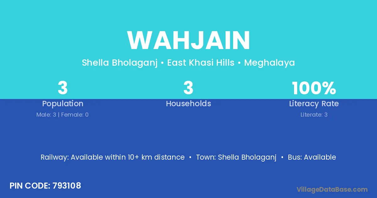 The literacy rate of Wahjain village is 100.00%. Male literacy stands at 100.00% and female literacy at 0%.