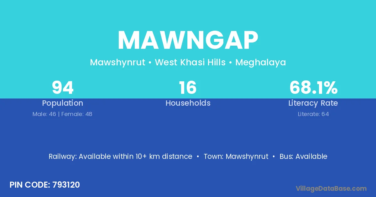 The literacy rate of Mawngap village is 62.44%. Male literacy stands at 53.93% and female literacy at 69.44%.