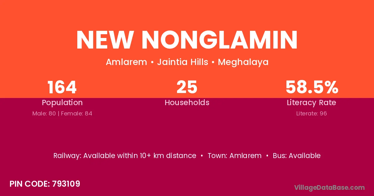 New Nonglamin village has a total population of 164 people, of which 80 are males and 84 are females.
