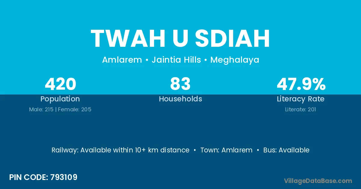 The literacy rate of Twah U Sdiah village is 47.86%. Male literacy stands at 48.37% and female literacy at 47.32%.