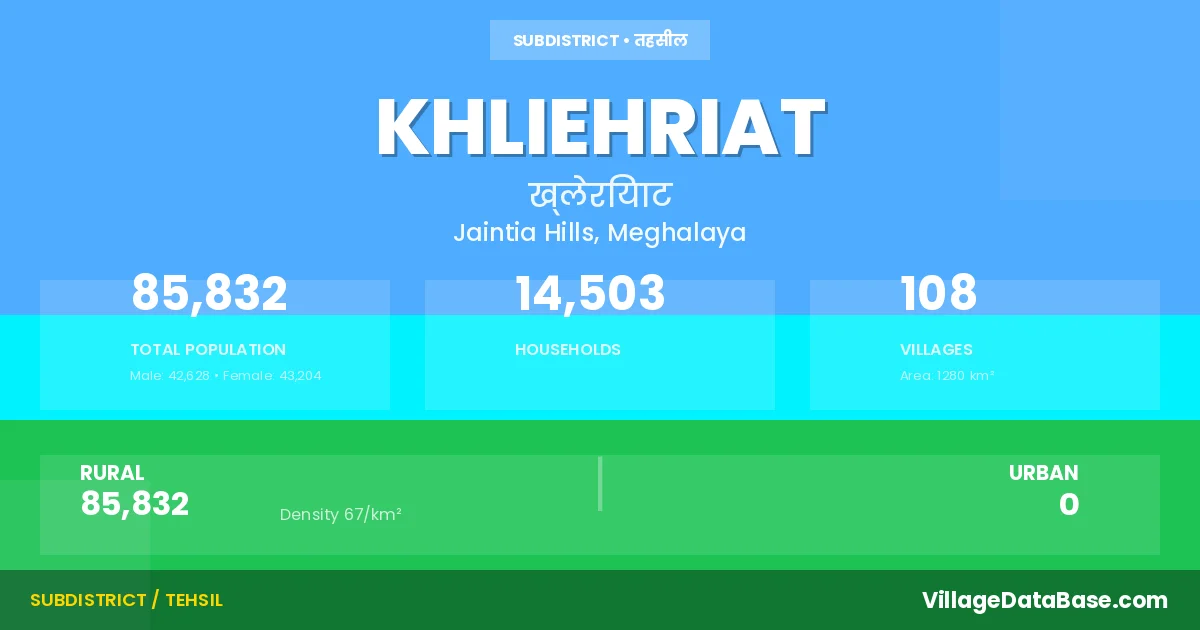 According to the 2011 census The total area of Khliehriat Subdivision is 1280 km², with a population of 85832 people. The population density is 67 inhabitants per square kilometre, and there are approximately 14503 houses in the sub district.