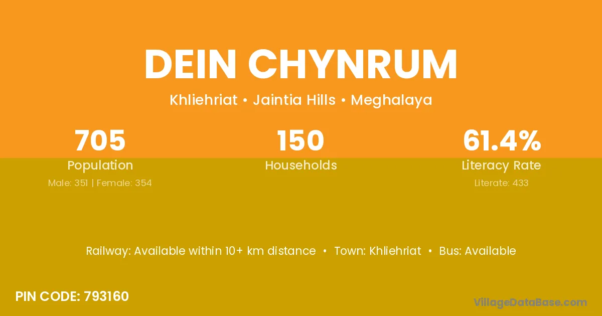 Khliehriat is the nearest town to Dein Chynrum village for major economic activities