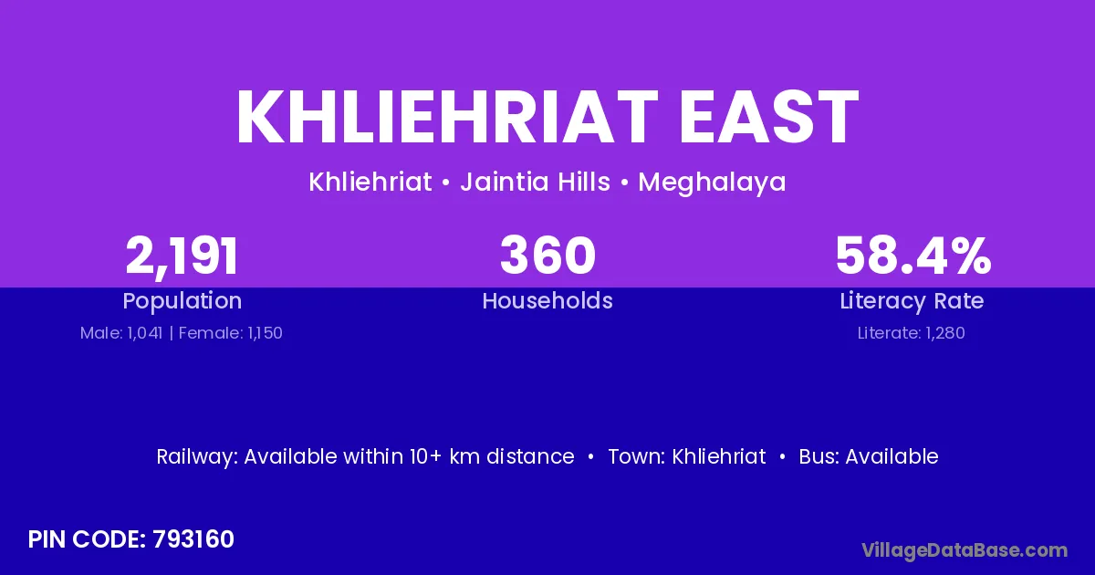 Khliehriat East village has a total population of 2,191 people, of which 1,041 are males and 1,150 are females.