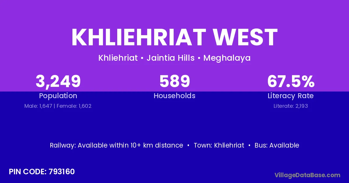 Khliehriat West village has a total population of 3,249 people, of which 1,647 are males and 1,602 are females.