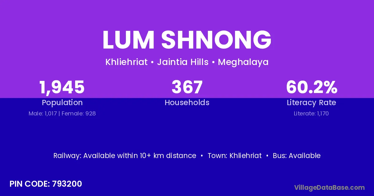 Lum Shnong village has a total population of 1,945 people, of which 1,017 are males and 928 are females.