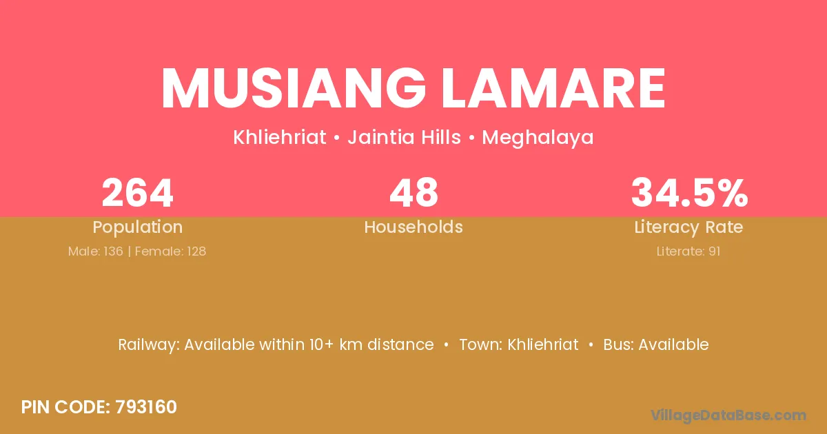 Musiang Lamare village has a total population of 264 people, of which 136 are males and 128 are females.