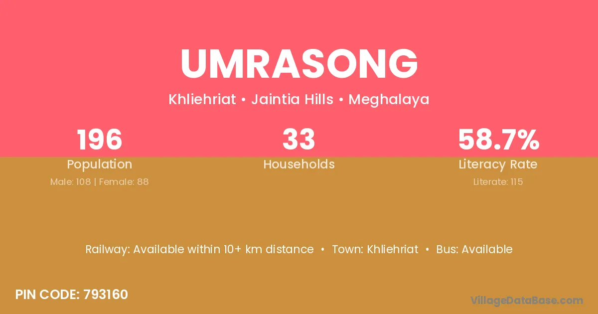 Umrasong village has a total population of 196 people, of which 108 are males and 88 are females.