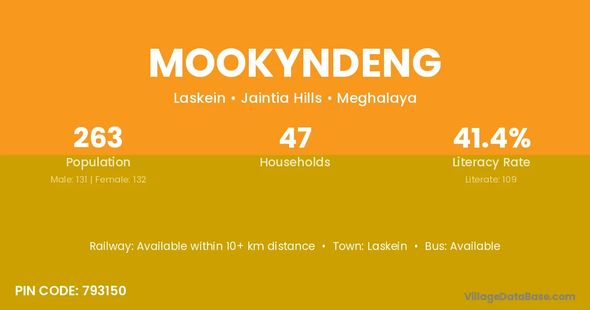 Mookyndeng village has a total population of 263 people, of which 131 are males and 132 are females.
