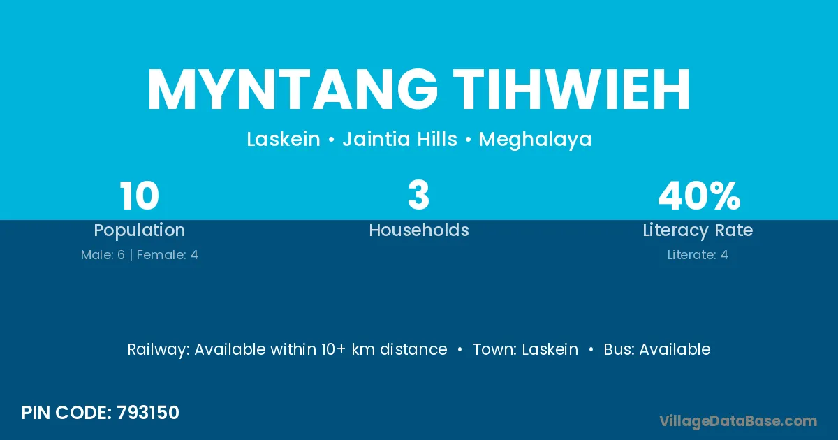 Myntang Tihwieh village is located in the Laskein Subdivision of the Jaintia Hills district in Meghalaya .
