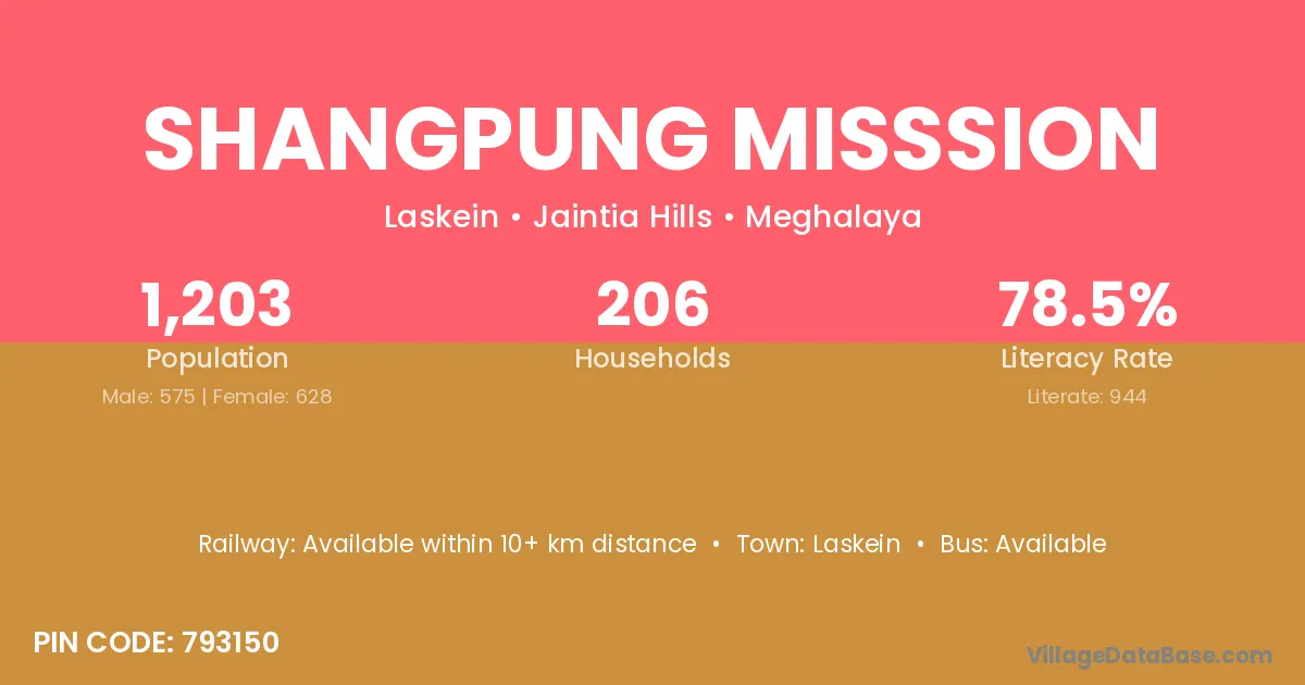 Shangpung Misssion village has a total population of 1,203 people, of which 575 are males and 628 are females.