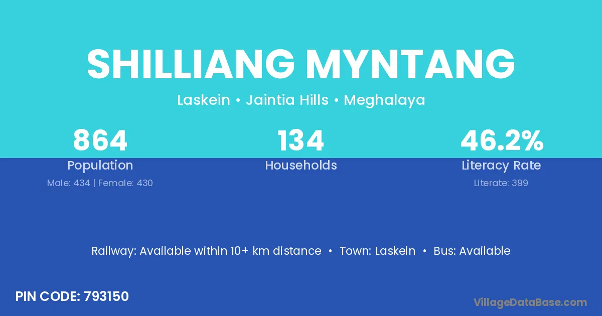 Shilliang Myntang village has a total population of 864 people, of which 434 are males and 430 are females.
