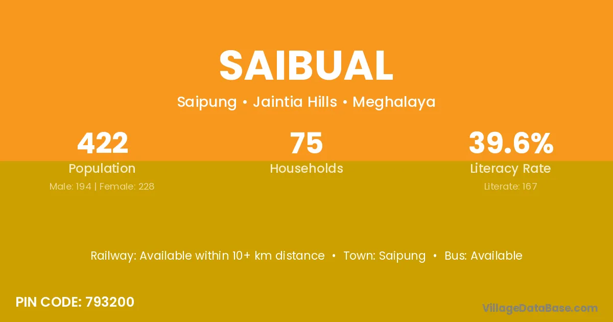 Saibual village has a total population of 422 people, of which 194 are males and 228 are females.