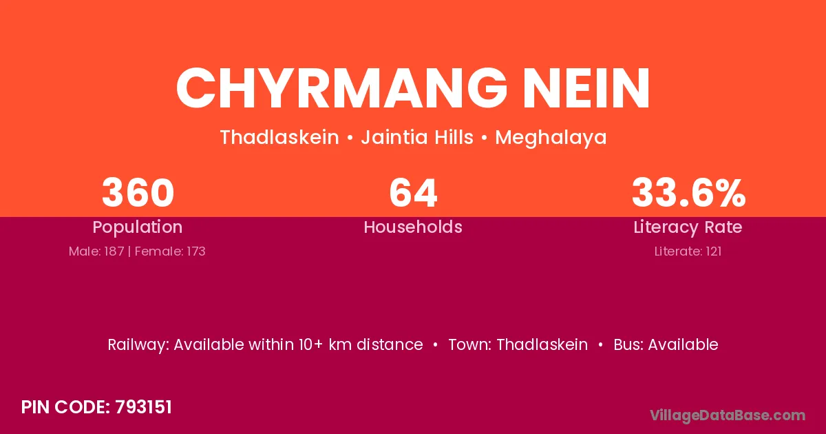 The literacy rate of Chyrmang Nein village is 33.61%. Male literacy stands at 33.16% and female literacy at 34.10%.
