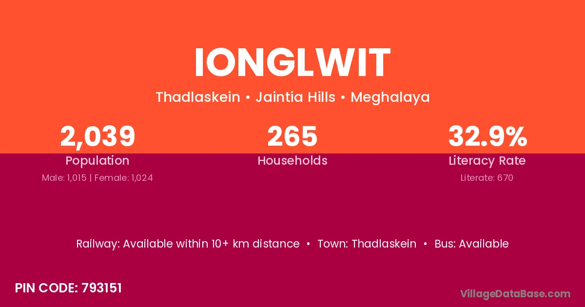Ionglwit village has a total population of 2,039 people, of which 1,015 are males and 1,024 are females.