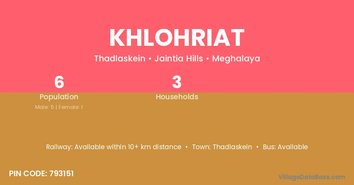 Khlohriat village has a total population of 6 people, of which 5 are males and 1 are females.