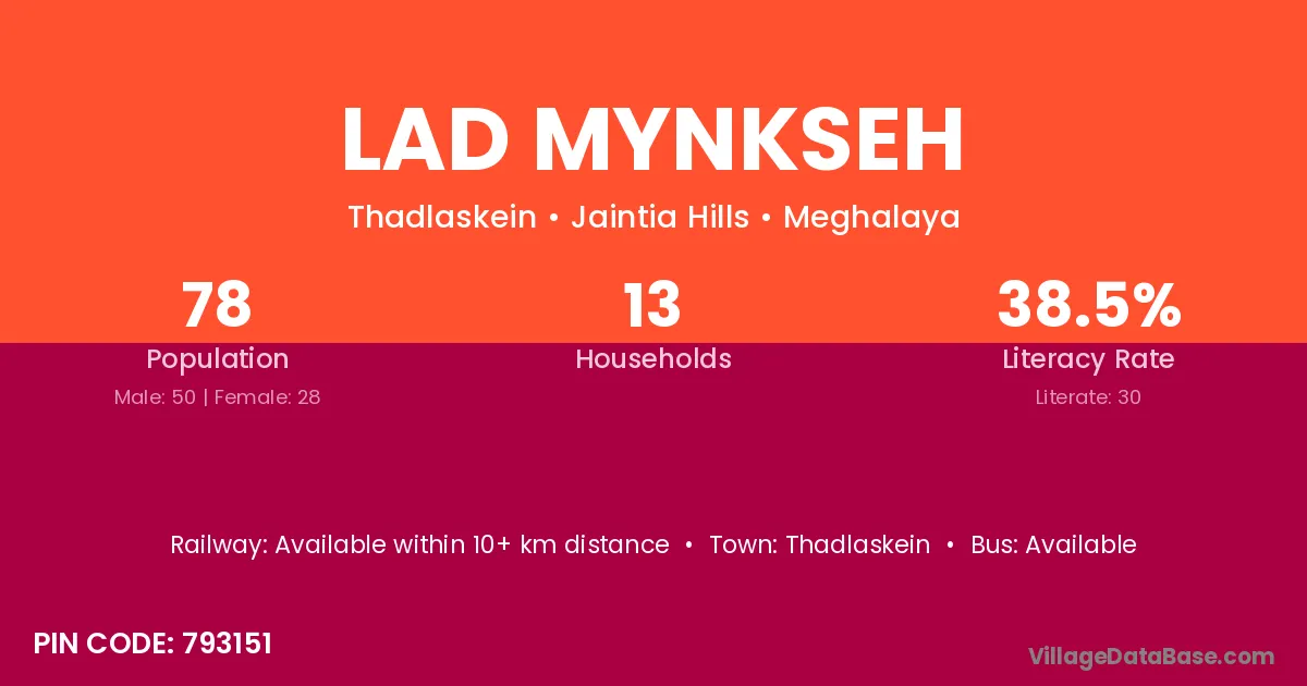 Lad Mynkseh village has a total population of 78 people, of which 50 are males and 28 are females.