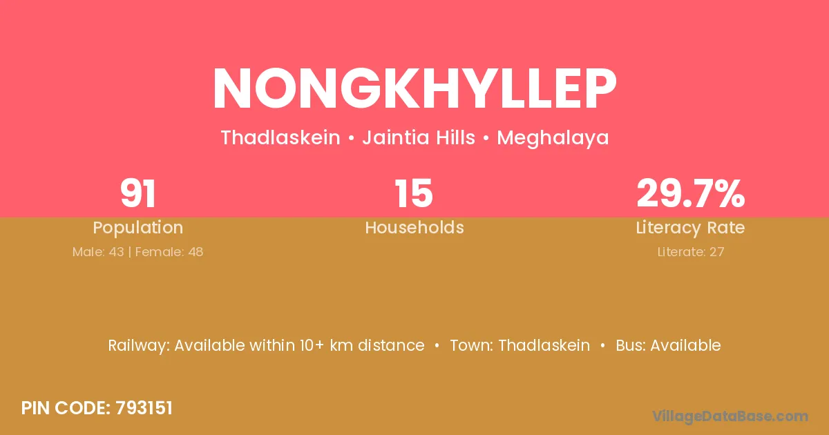 Nongkhyllep village has a total population of 91 people, of which 43 are males and 48 are females.
