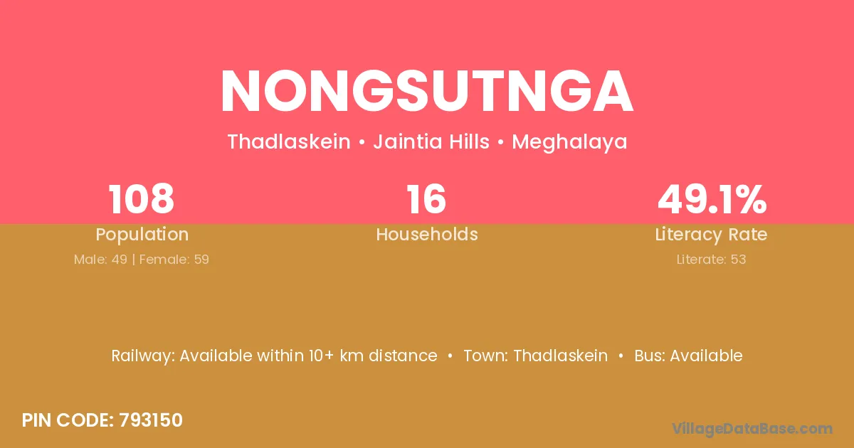 Nongsutnga village has a total population of 108 people, of which 49 are males and 59 are females.