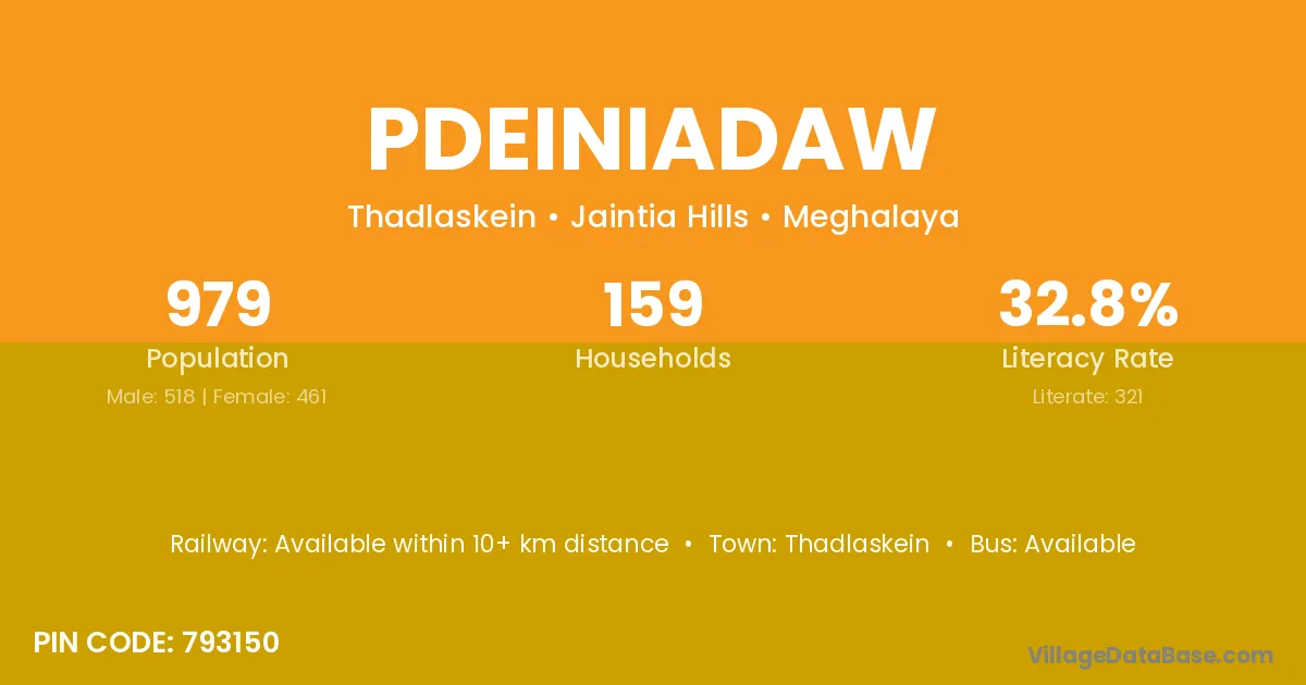 Thadlaskein is the nearest town to Pdeiniadaw village for major economic activities