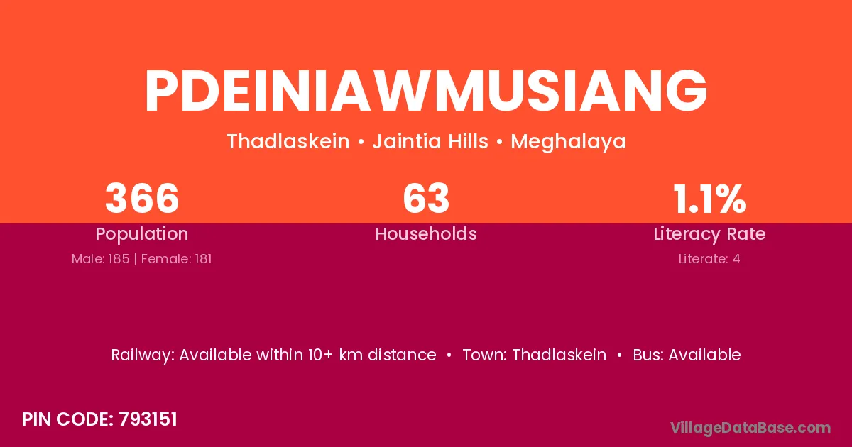 Pdeiniawmusiang village has a total population of 366 people, of which 185 are males and 181 are females.