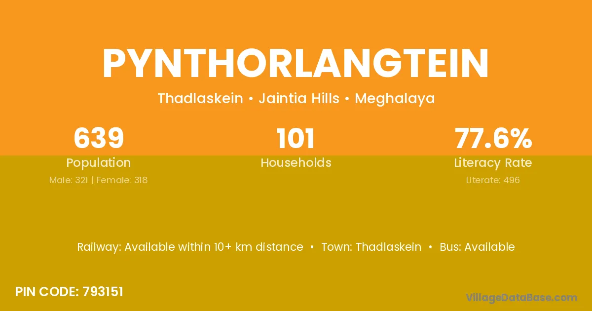 Pynthorlangtein village has a total population of 639 people, of which 321 are males and 318 are females.