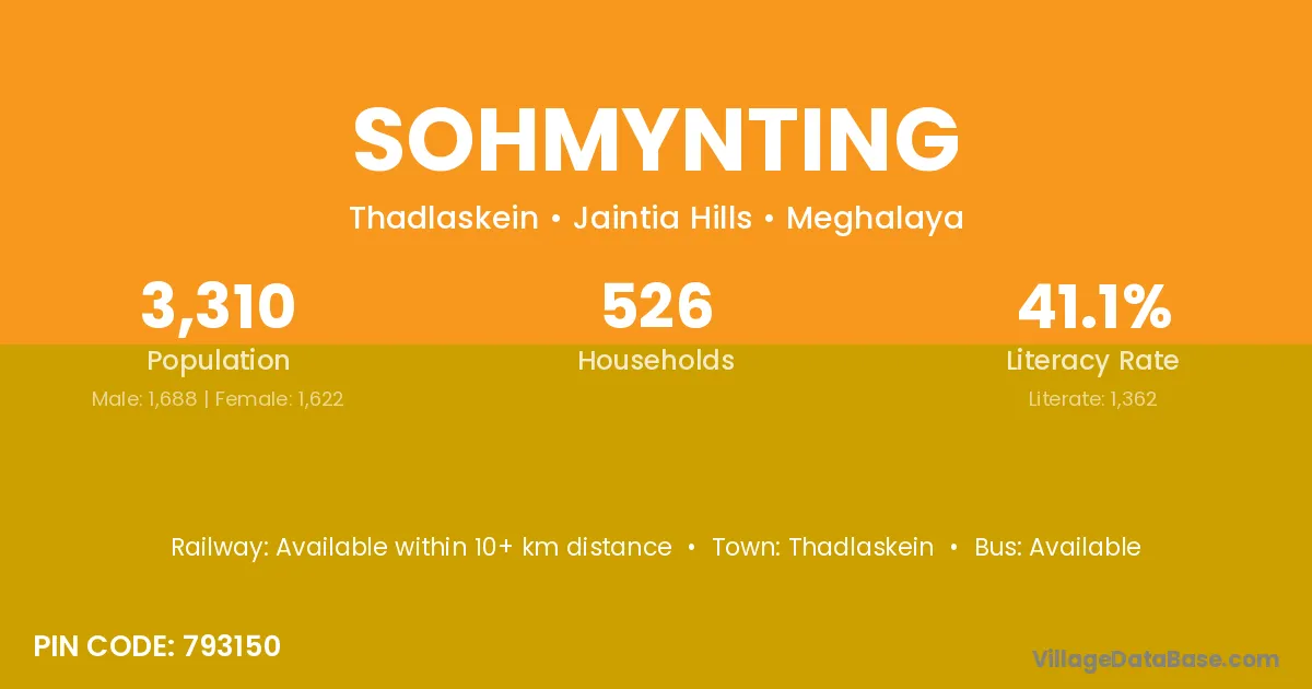 Sohmynting village has a total population of 3,310 people, of which 1,688 are males and 1,622 are females.