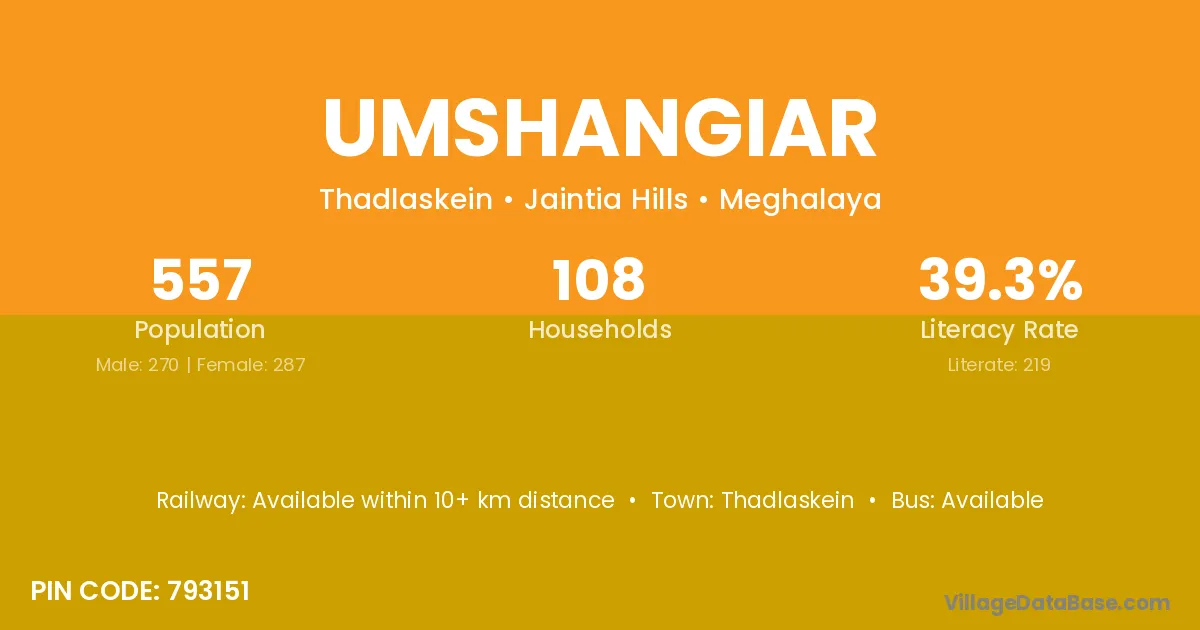 Umshangiar village has a total population of 557 people, of which 270 are males and 287 are females.
