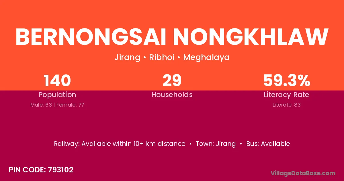 Bernongsai Nongkhlaw village has a total population of 140 people, of which 63 are males and 77 are females.