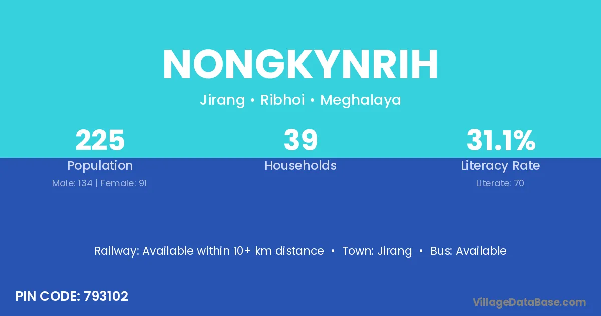 Nongkynrih village has a total population of 225 people, of which 134 are males and 91 are females.