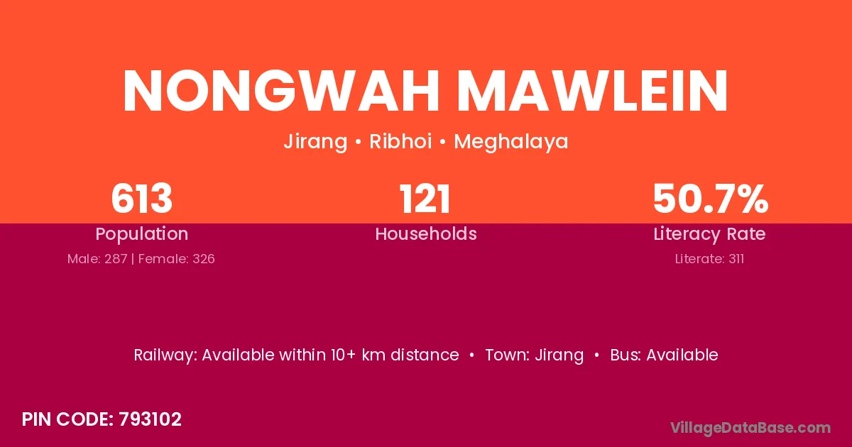 The literacy rate of Nongwah Mawlein village is 50.73%. Male literacy stands at 57.14% and female literacy at 45.09%.