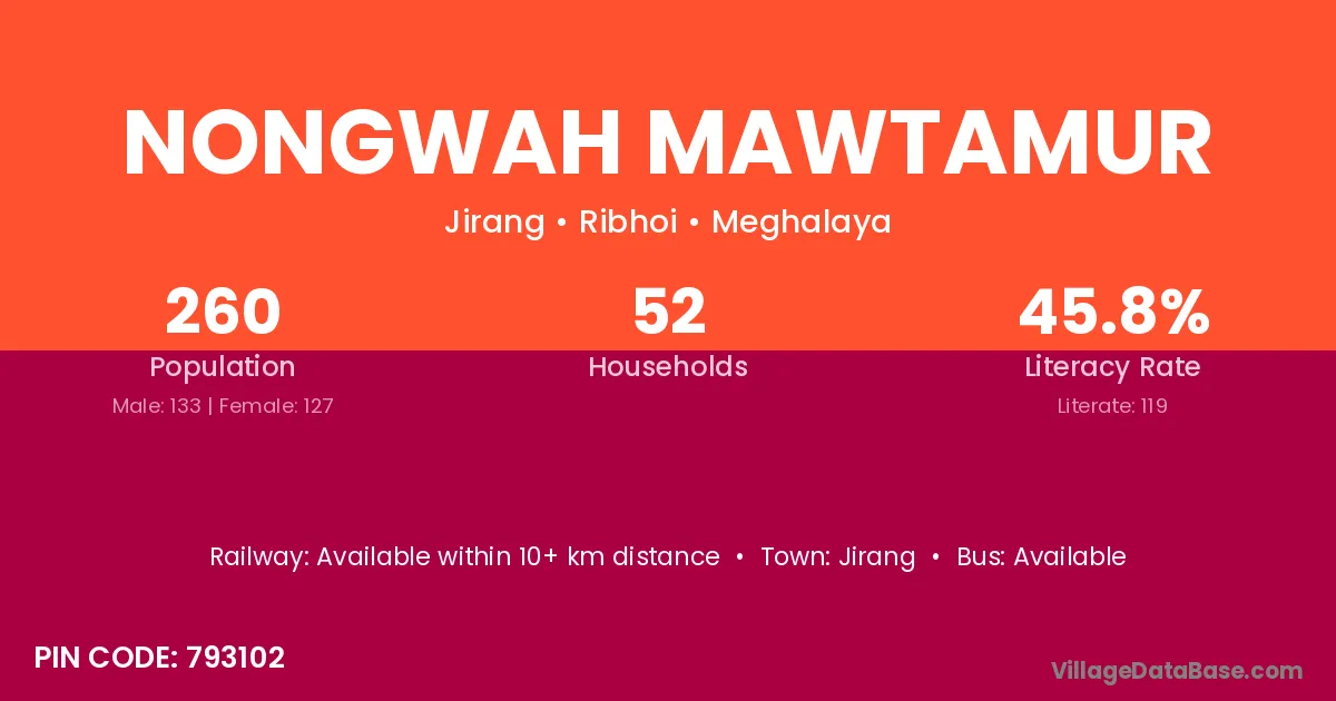 Nongwah Mawtamur village has a total population of 260 people, of which 133 are males and 127 are females.