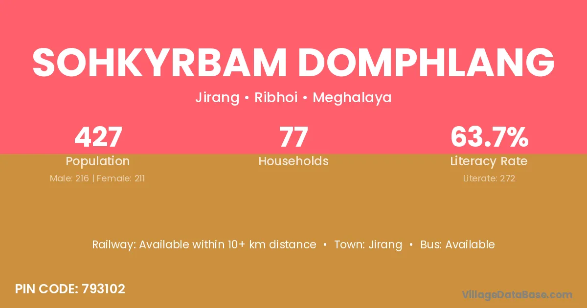 Sohkyrbam Domphlang village has a total population of 427 people, of which 216 are males and 211 are females.