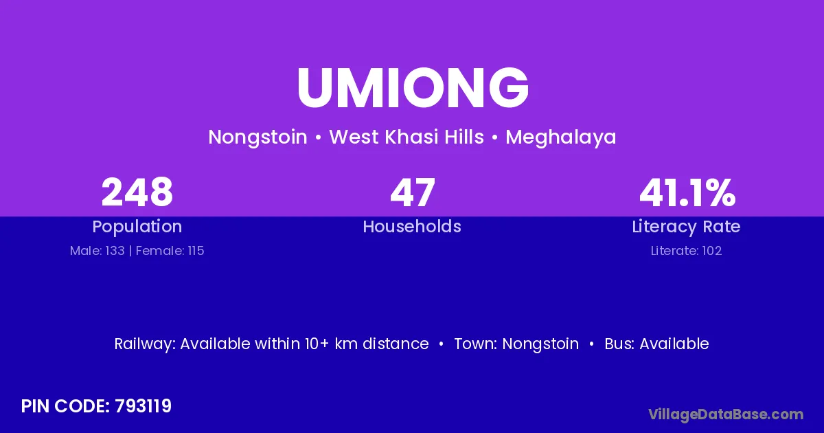 The literacy rate of Umiong village is 72.42%. Male literacy stands at 77.38% and female literacy at 68.06%.
