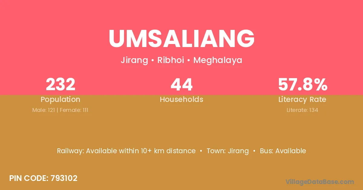Umsaliang village has a total population of 232 people, of which 121 are males and 111 are females.