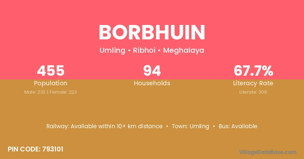 Borbhuin village has a total population of 455 people, of which 232 are males and 223 are females.