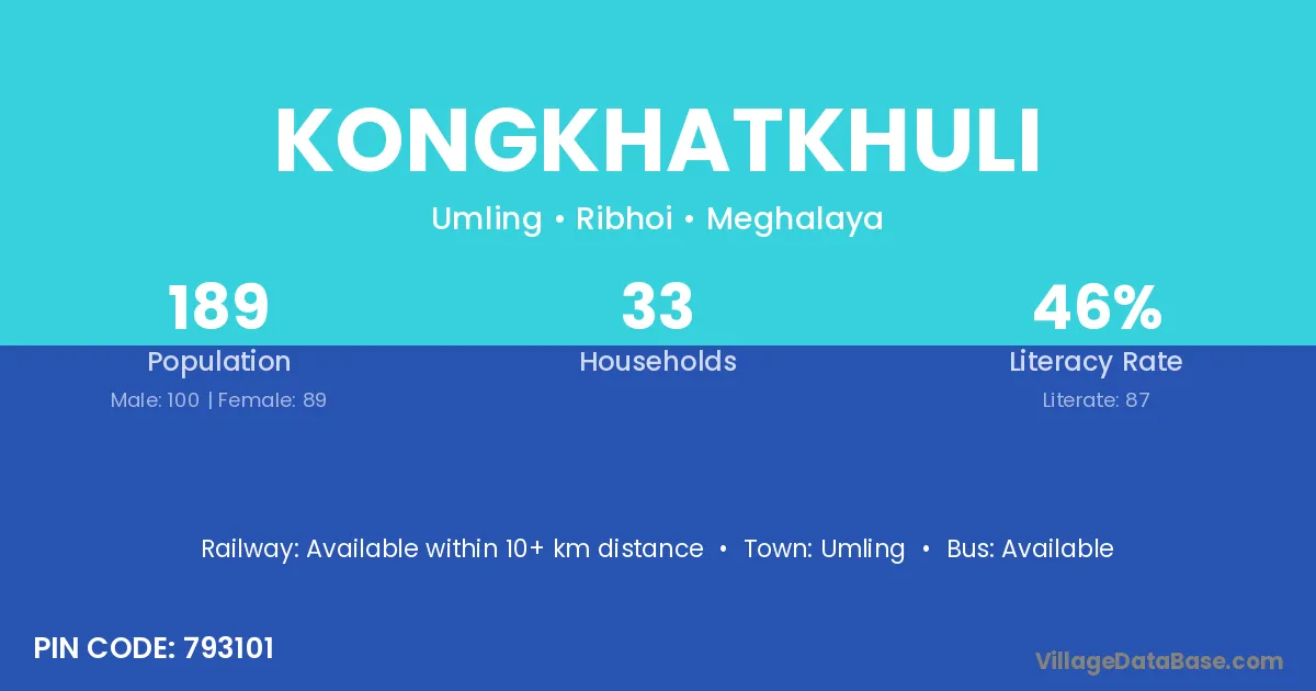 Kongkhatkhuli village has a total population of 189 people, of which 100 are males and 89 are females.