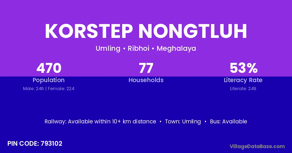 Korstep Nongtluh village has a total population of 470 people, of which 246 are males and 224 are females.