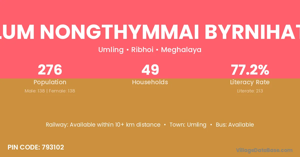 Lum Nongthymmai Byrnihat village has a total population of 276 people, of which 138 are males and 138 are females.