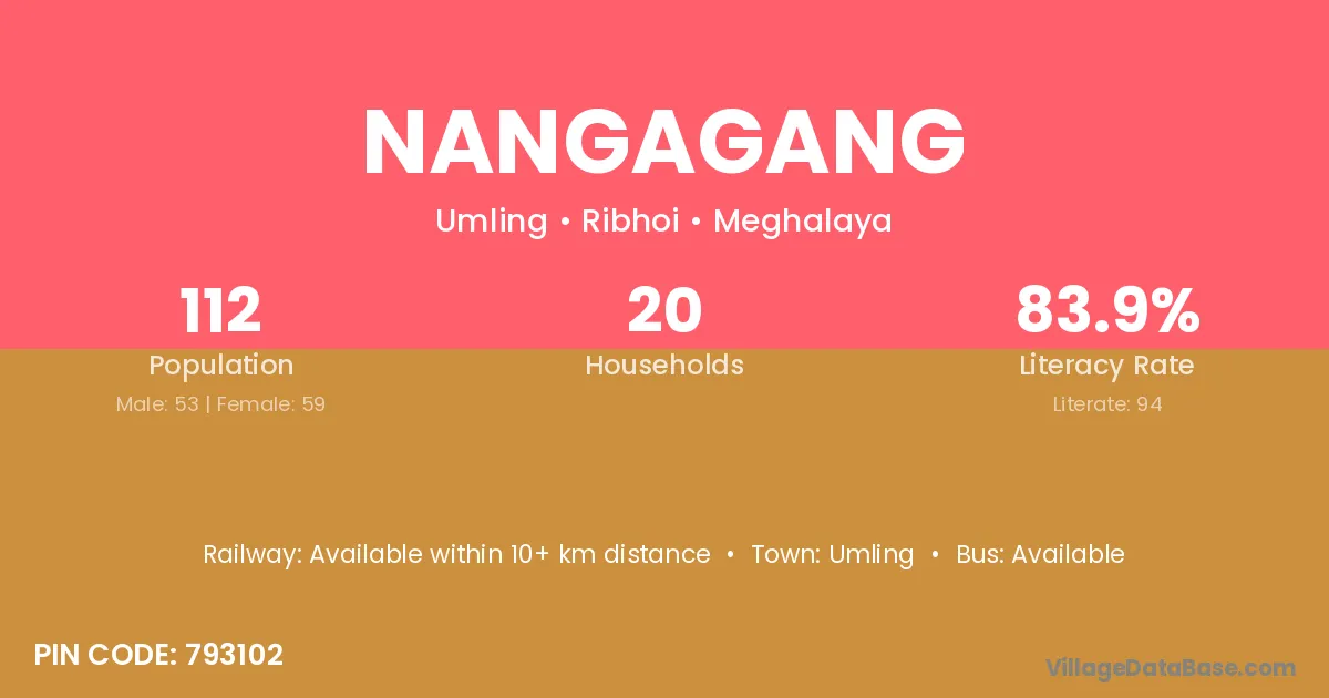 Nangagang village has a total population of 112 people, of which 53 are males and 59 are females.
