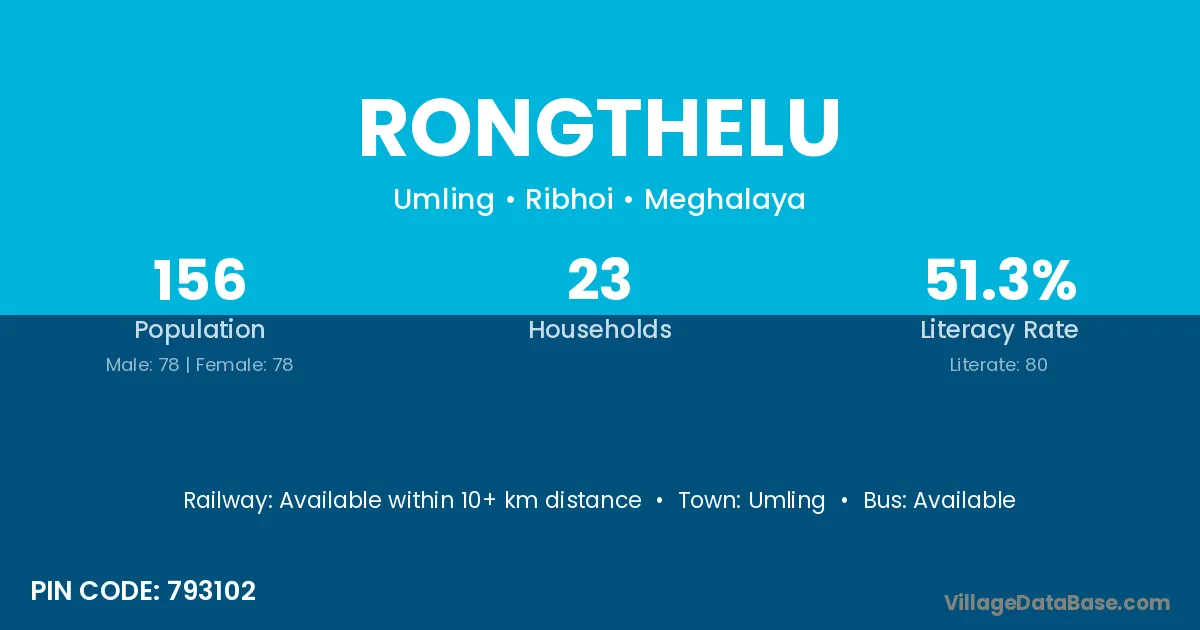 Rongthelu village has a total population of 156 people, of which 78 are males and 78 are females.