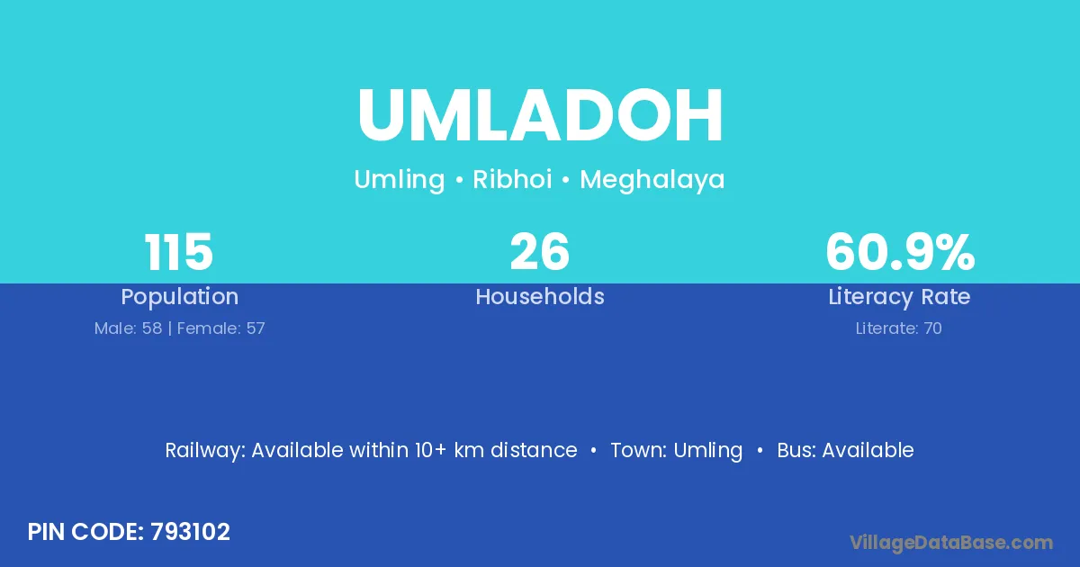 Umladoh village has a total population of 115 people, of which 58 are males and 57 are females.