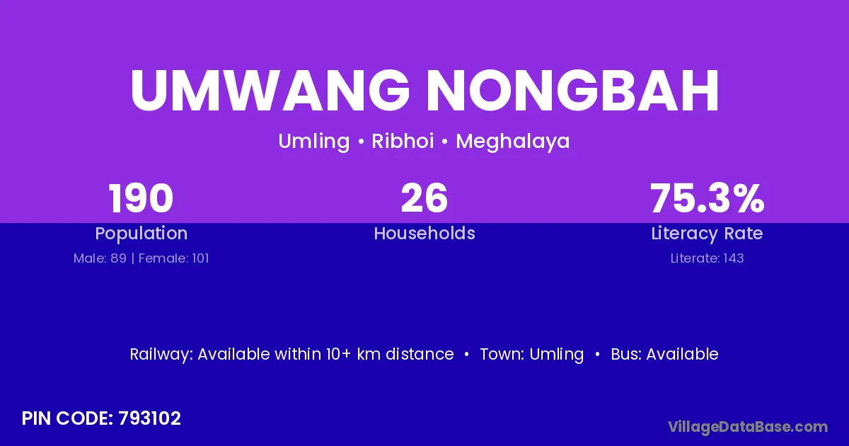 Umwang Nongbah village has a total population of 190 people, of which 89 are males and 101 are females.