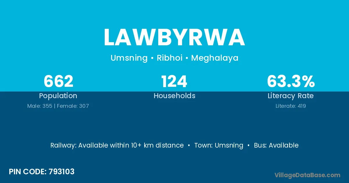 Lawbyrwa village has a total population of 662 people, of which 355 are males and 307 are females.
