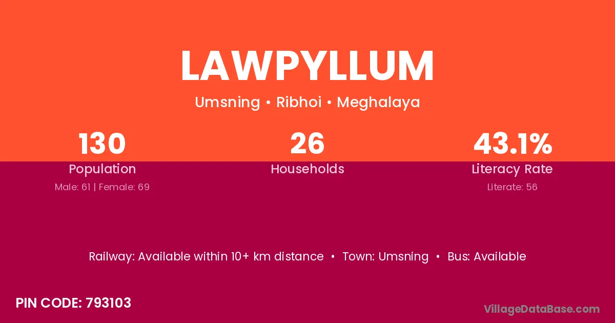 Lawpyllum village has a total population of 130 people, of which 61 are males and 69 are females.
